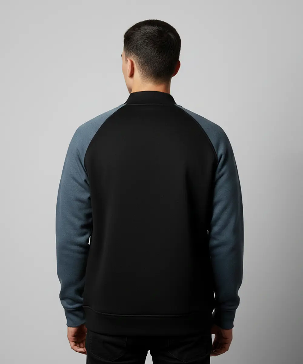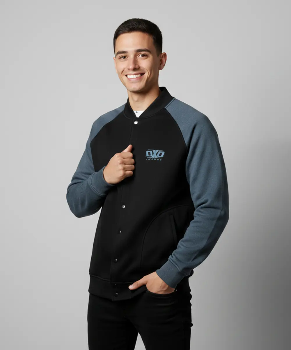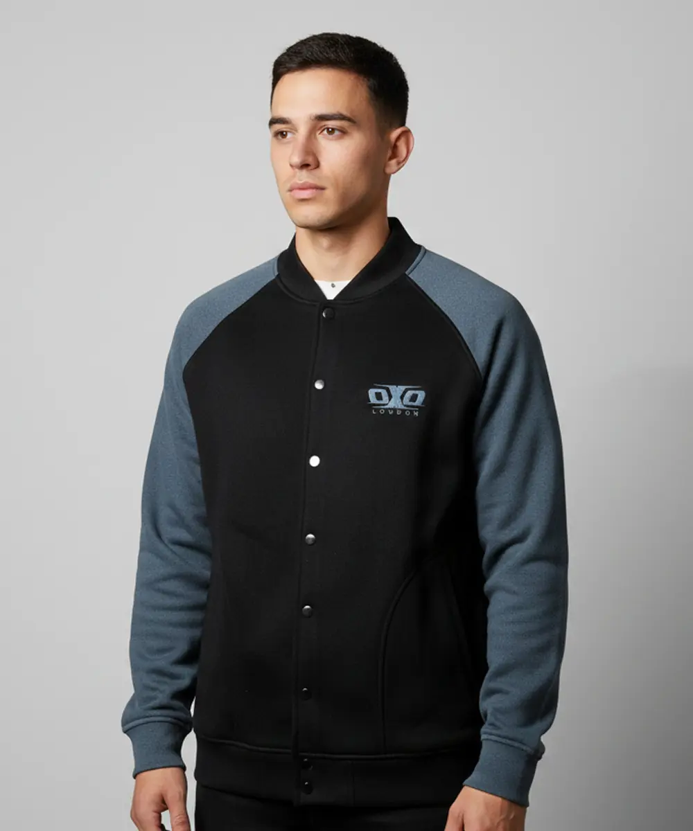 Modern Minimalist Design: A clean varsity-inspired jacket with a sleek snap-button front and smooth bomber-style structure.