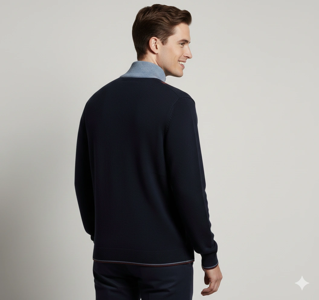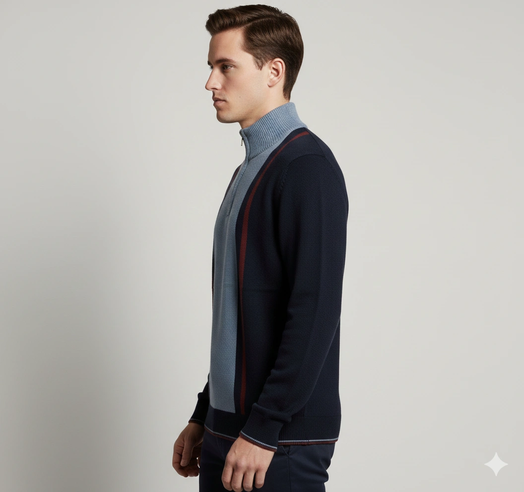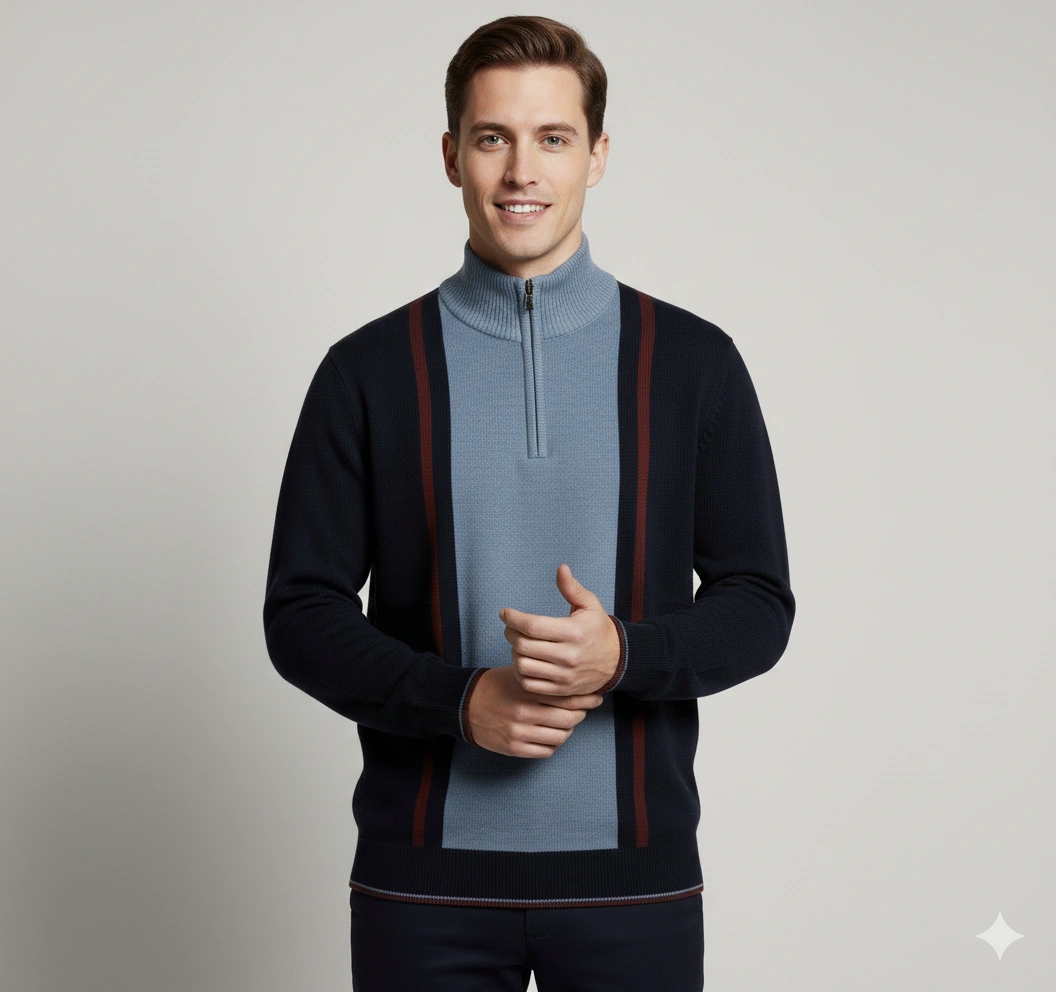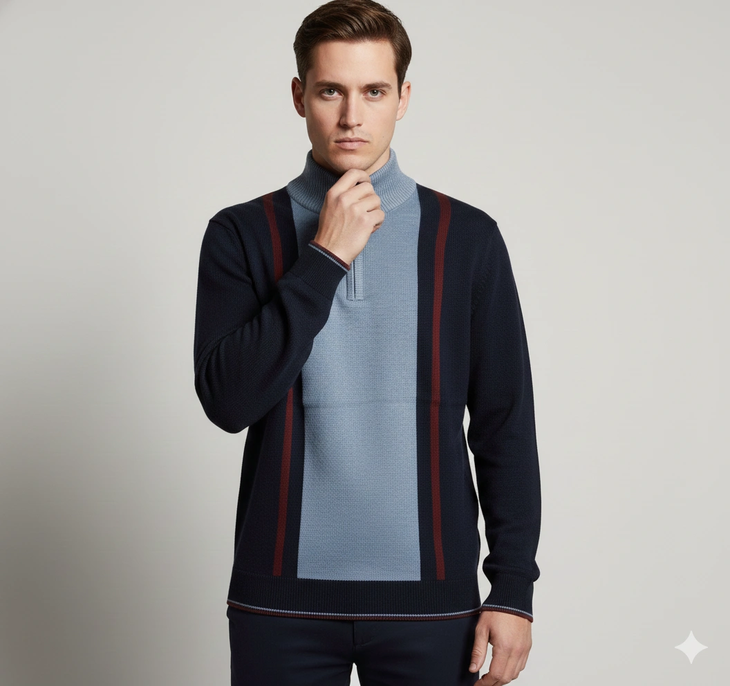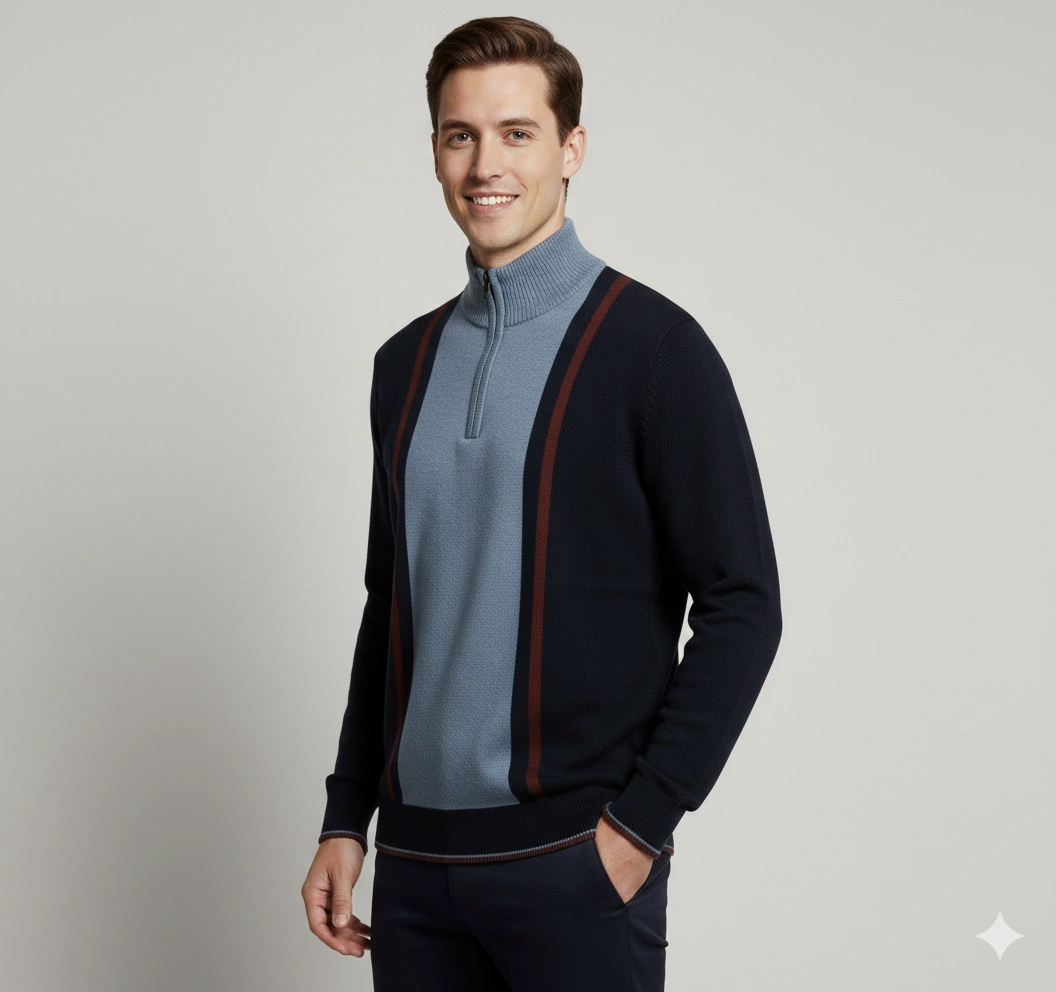 This men’s half-zip pullover delivers a modern, structured look with its bold contrast panels and refined stand collar. Crafted from a soft, durable blended yarn, it offers warmth without the bulk and provides all-day comfort during cooler seasons. The half-zip neckline allows versatile styling—wear it zipped for a smart, polished look or open for relaxed layering. Ribbed cuffs and hem give it a clean, tailored finish. Perfect for pairing with jeans or chinos for smart-casual winter outfits.