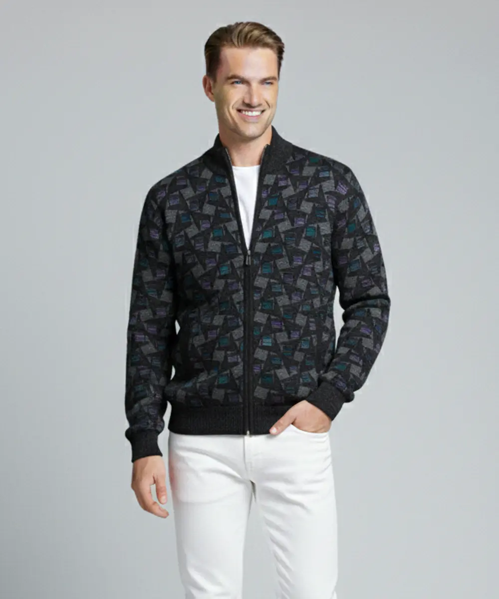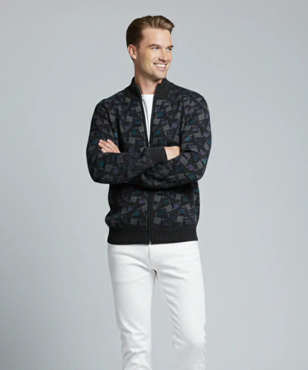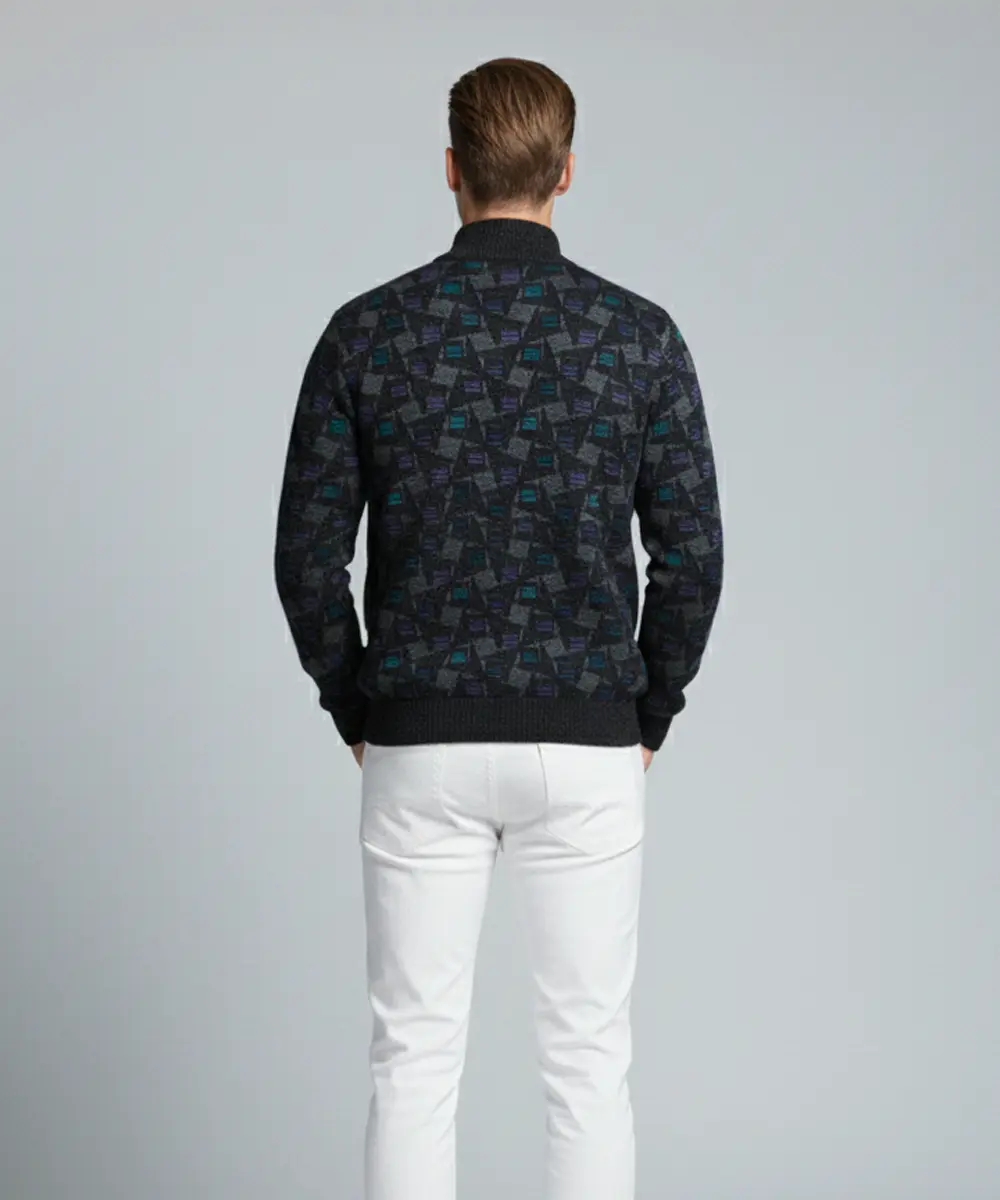 Men’s Black Geometric Pattern Zip-Up Knit Sweater