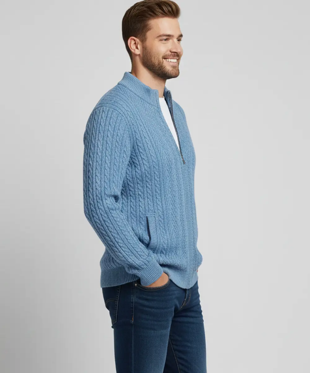 This men’s zip-up knit cardigan combines modern style with everyday comfort. Featuring a refined textured pattern, it offers a clean and versatile look suitable for casual and smart-casual wear. The full-zip front allows easy layering over T-shirts or shirts. Designed for a tailored fit, it’s an essential piece for transitional seasons.