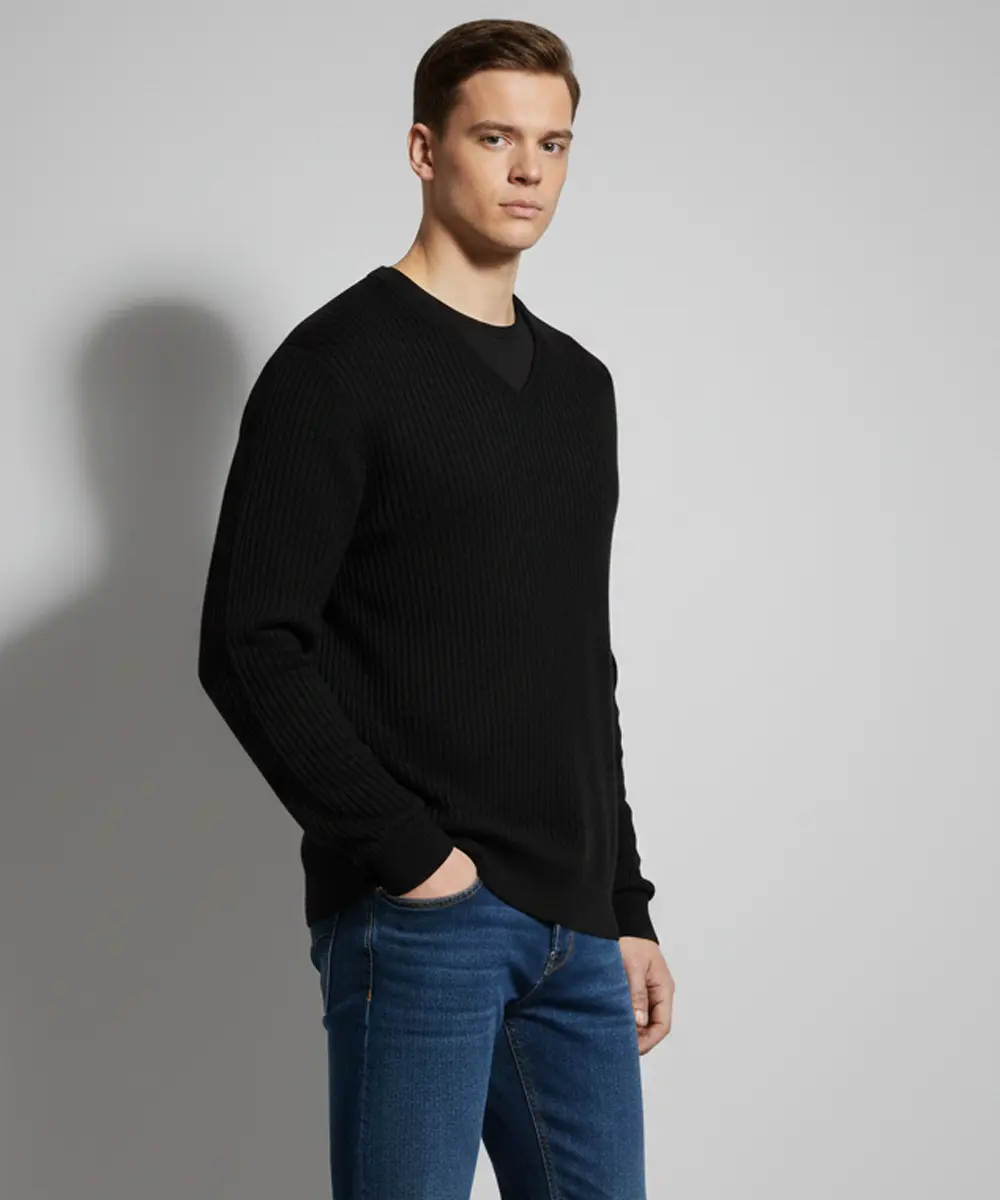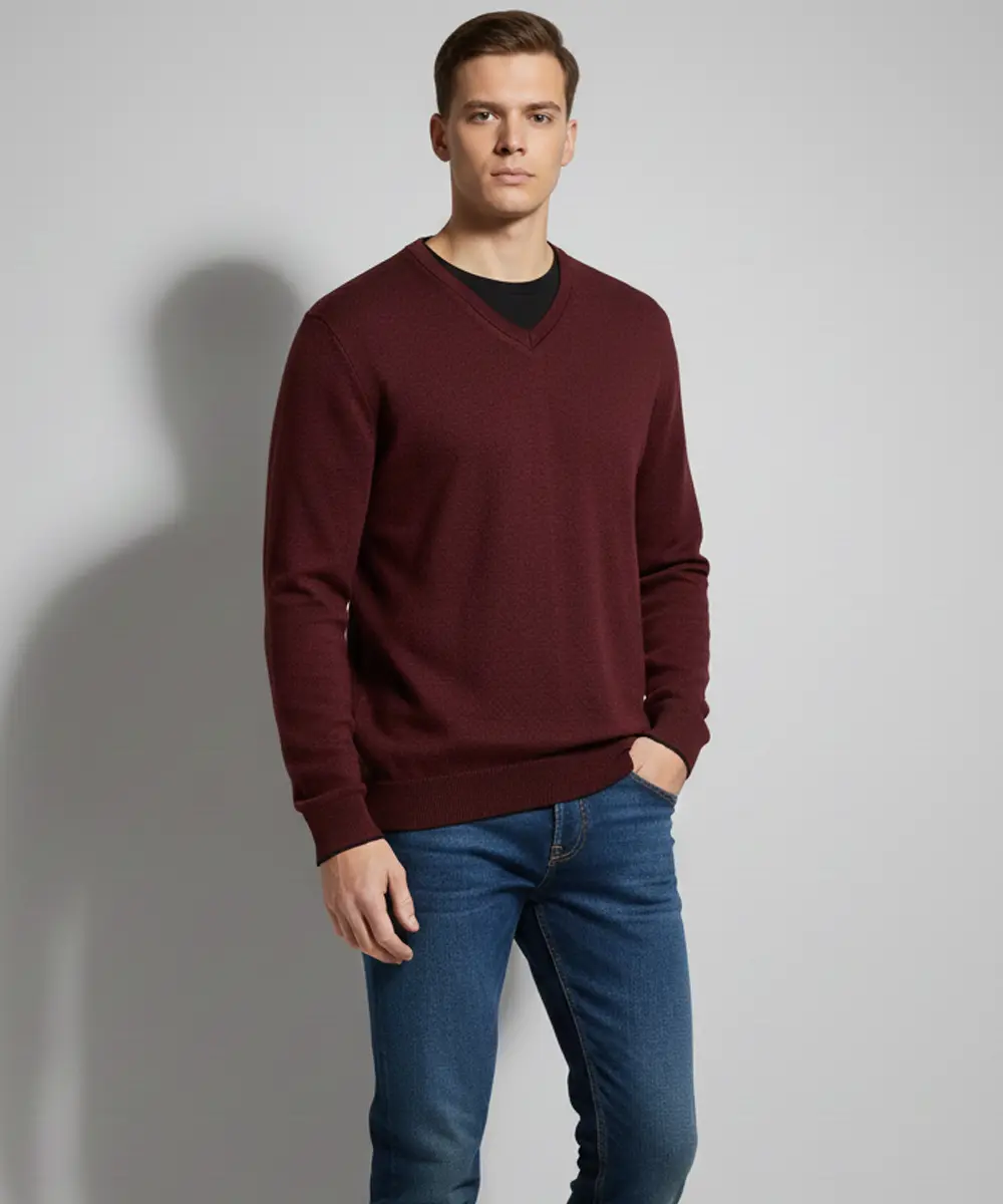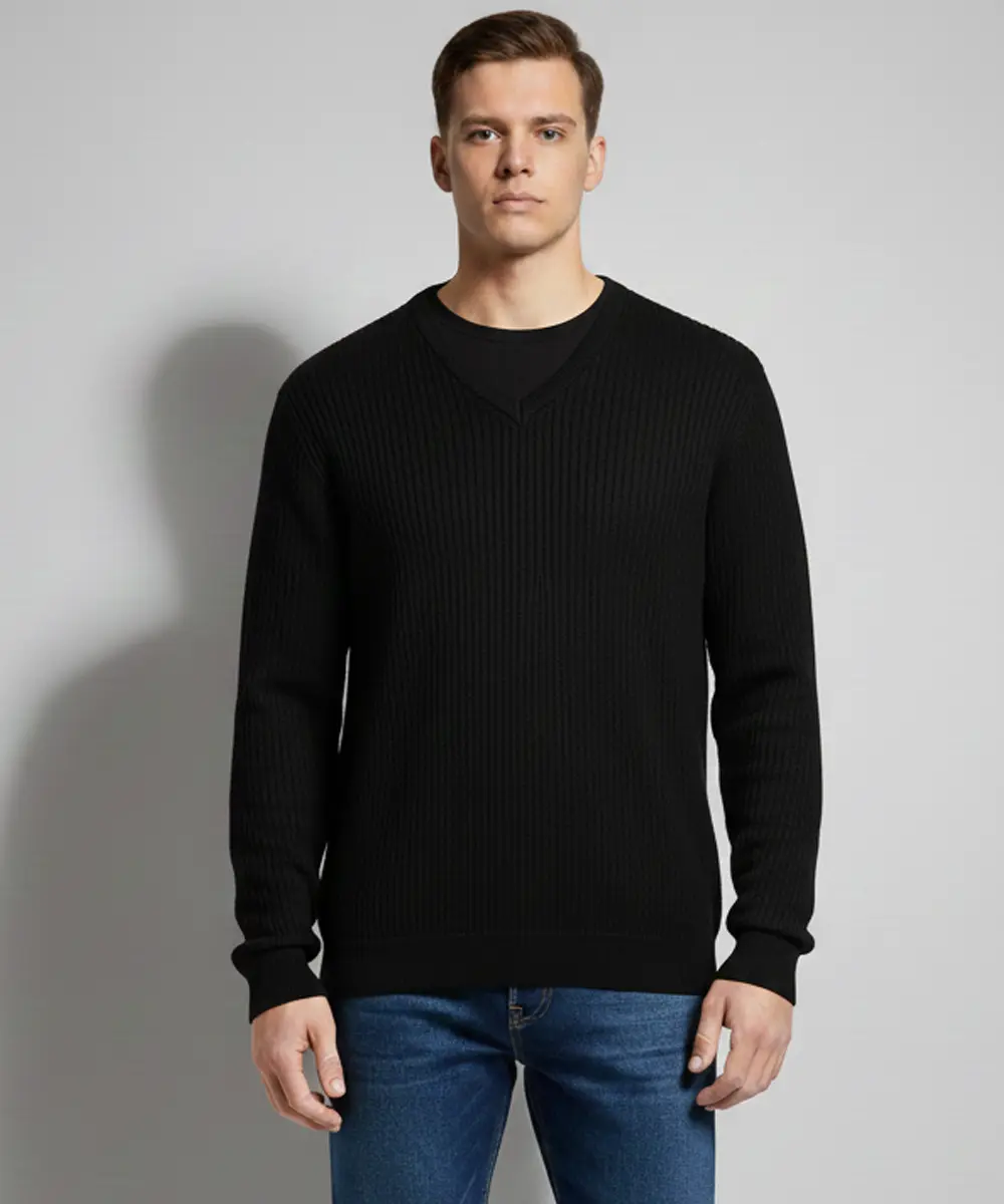 This men’s V-neck knit sweater delivers a refined, casual look with timeless appeal. Designed with a subtle all-over pattern, it balances style and comfort effortlessly. The tailored fit makes it ideal for both everyday wear and smart-casual occasions. Easy to layer or wear on its own, it’s a versatile wardrobe essential.