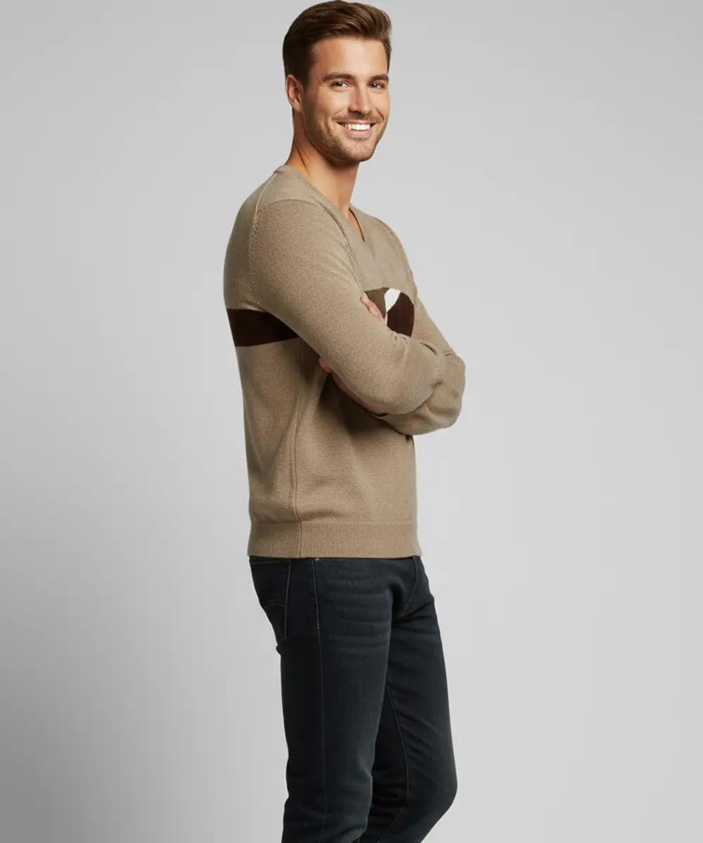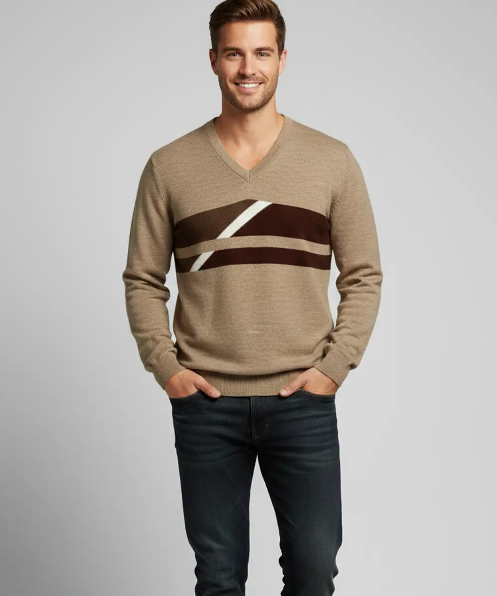 Men’s Reversible Brown and Beige V-Neck Patterned Knit Sweater