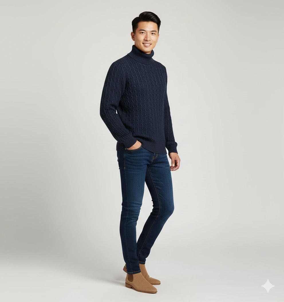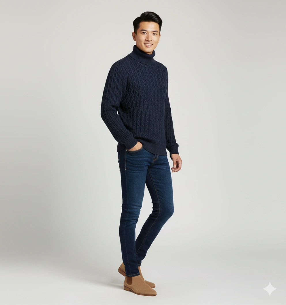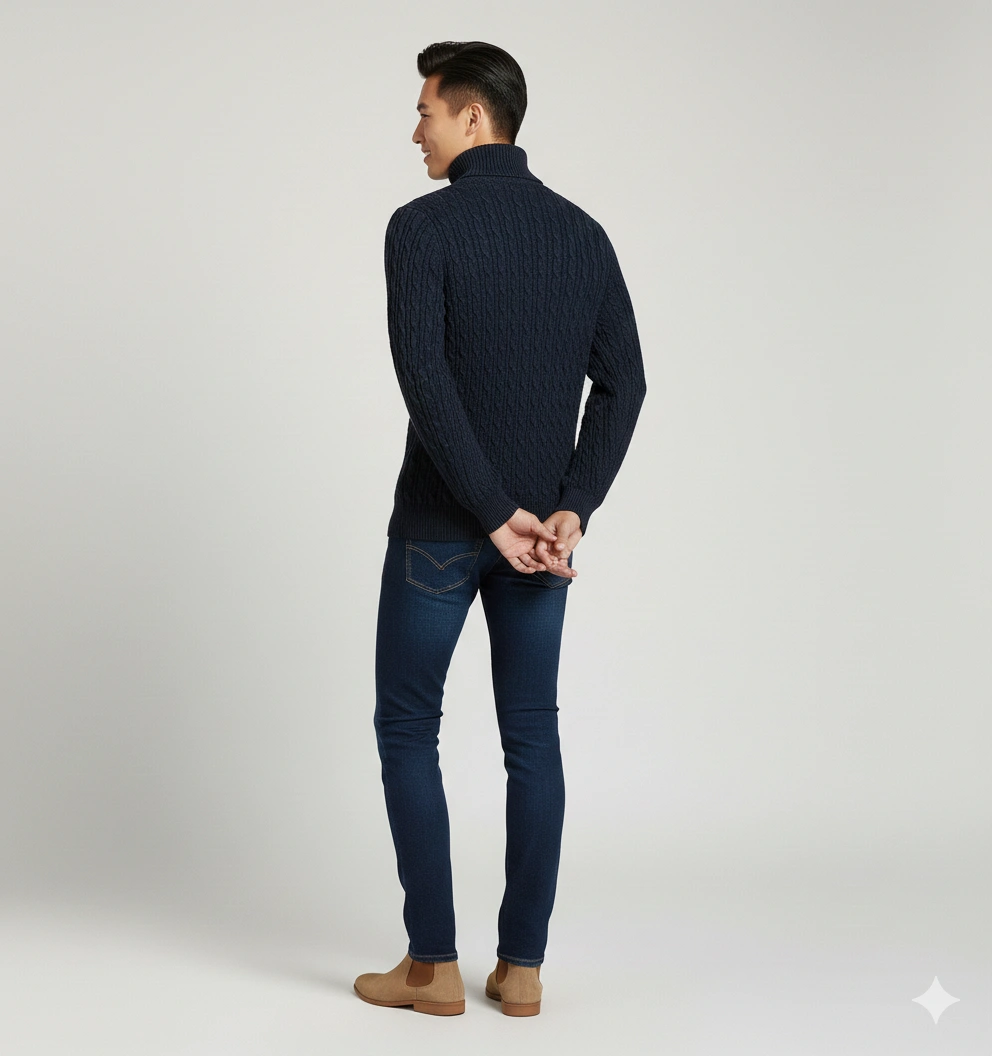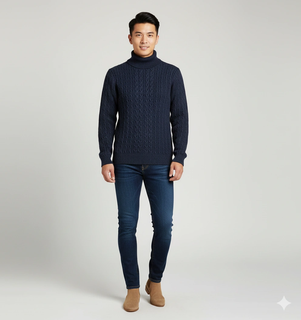 Navy blue premium cable knit turtleneck pullover