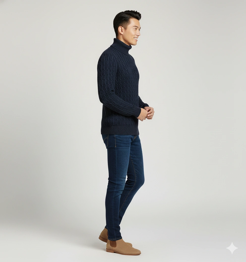 This men’s cable-knit turtleneck pullover blends timeless winter style with a warm, comfortable fit. Made from a soft blended yarn, it features a rich cable texture and a structured roll-neck design that provides superior insulation in cold weather. Ribbed cuffs and hem deliver a sharp, tailored silhouette while helping the sweater maintain its shape. Perfect for pairing with jeans, tailored trousers, or boots for an elevated winter look. Ideal for work, evenings out, or classic everyday layering.