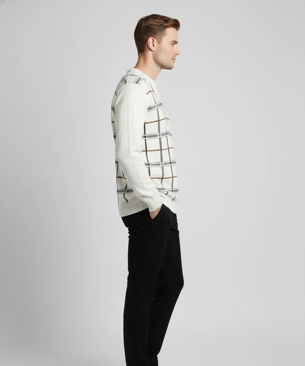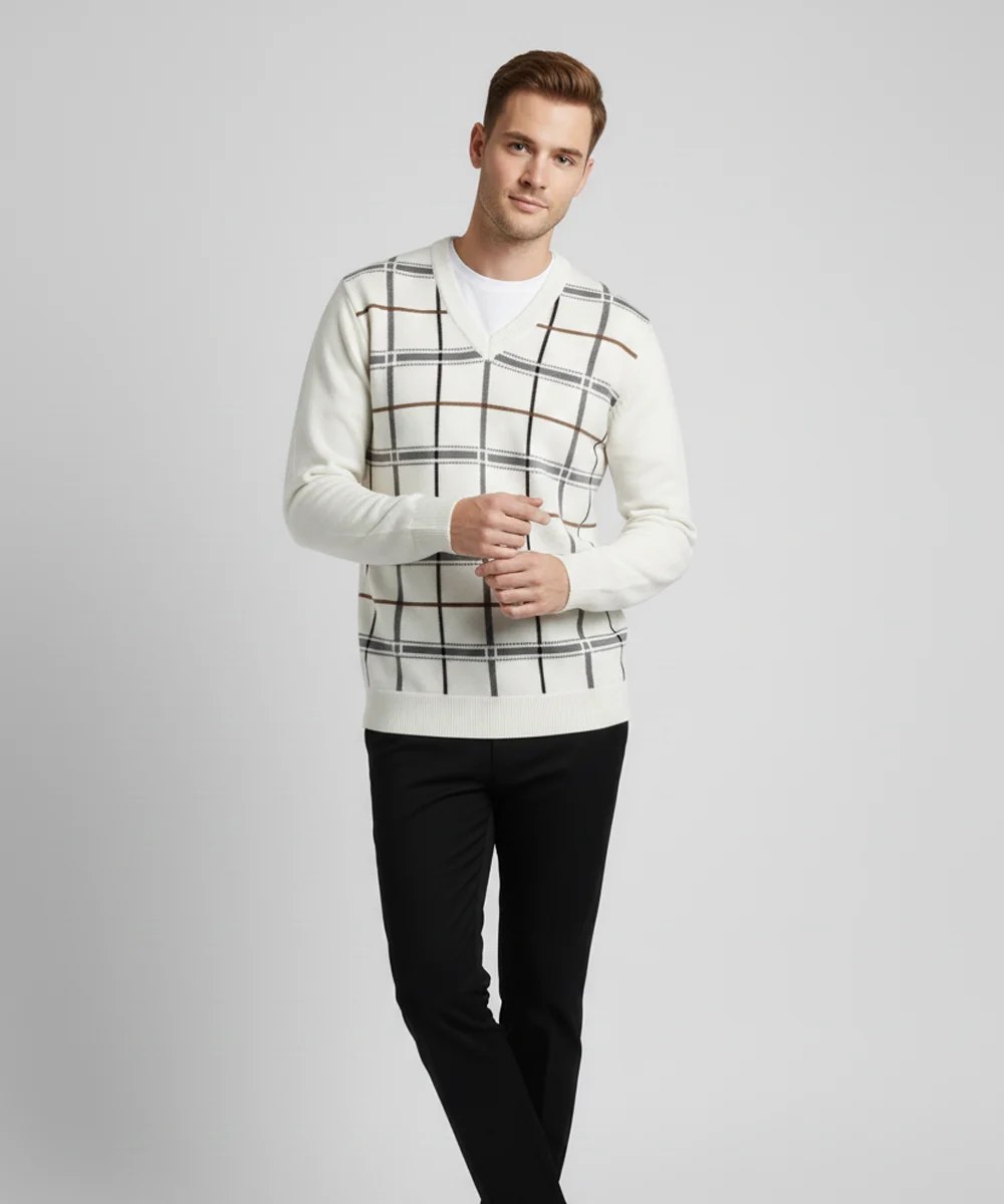 This men’s V-neck check sweater blends timeless style with a comfortable, modern fit. Made from a soft, blended knit, it provides lightweight warmth perfect for both casual and smart dressing. The bold check pattern adds a refined statement while maintaining a clean, minimal aesthetic. Ribbed cuffs and hem ensure a structured look that holds its shape throughout the day. Ideal for layering over tees or shirts, making it a versatile wardrobe essential.