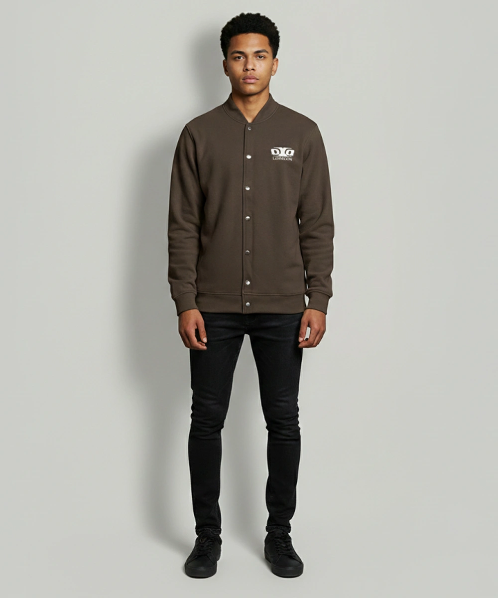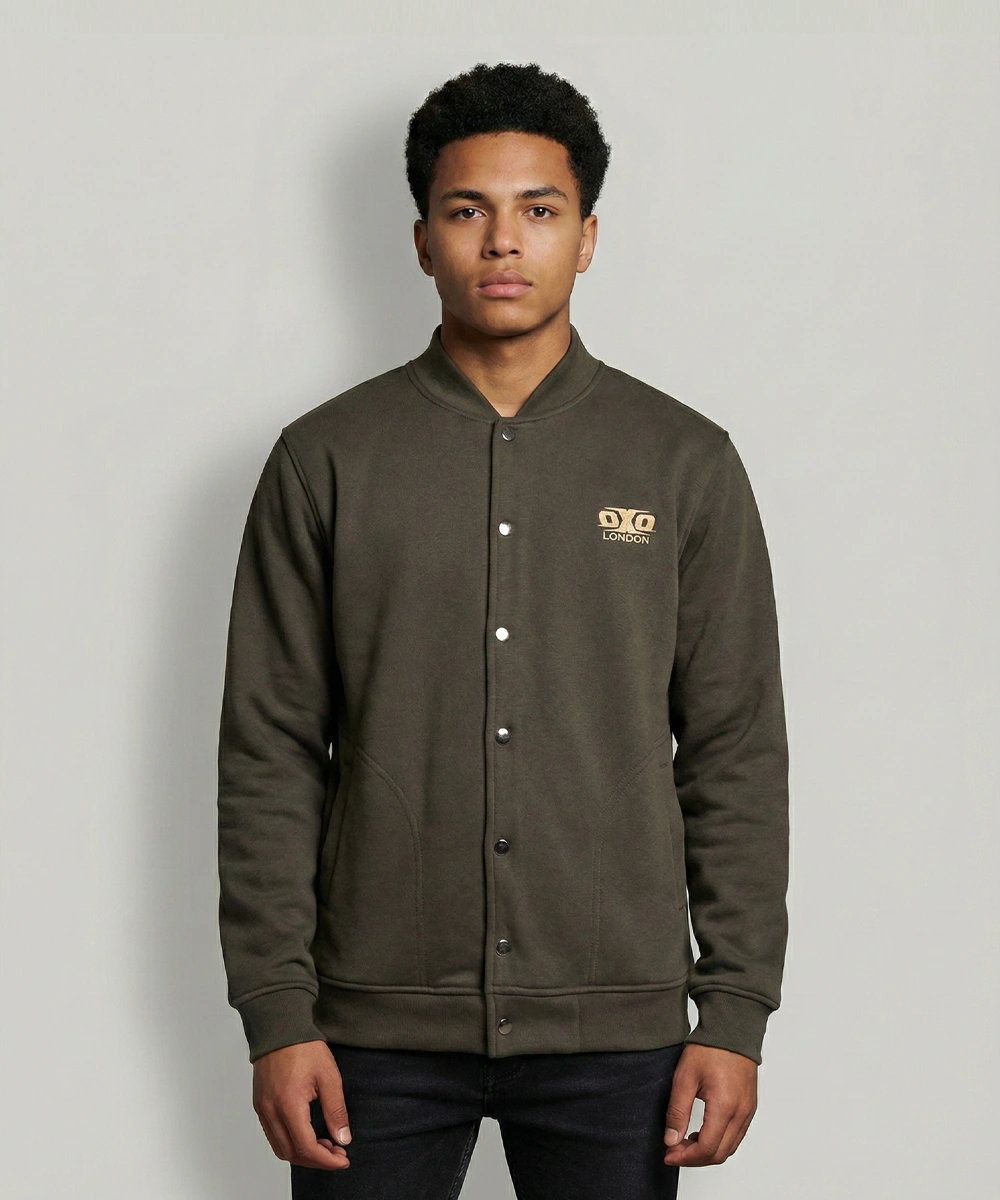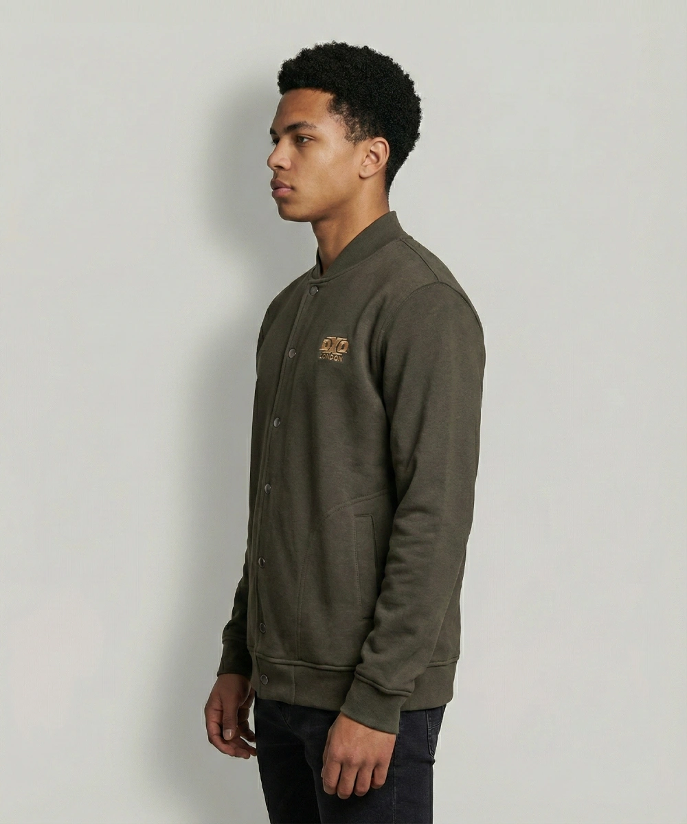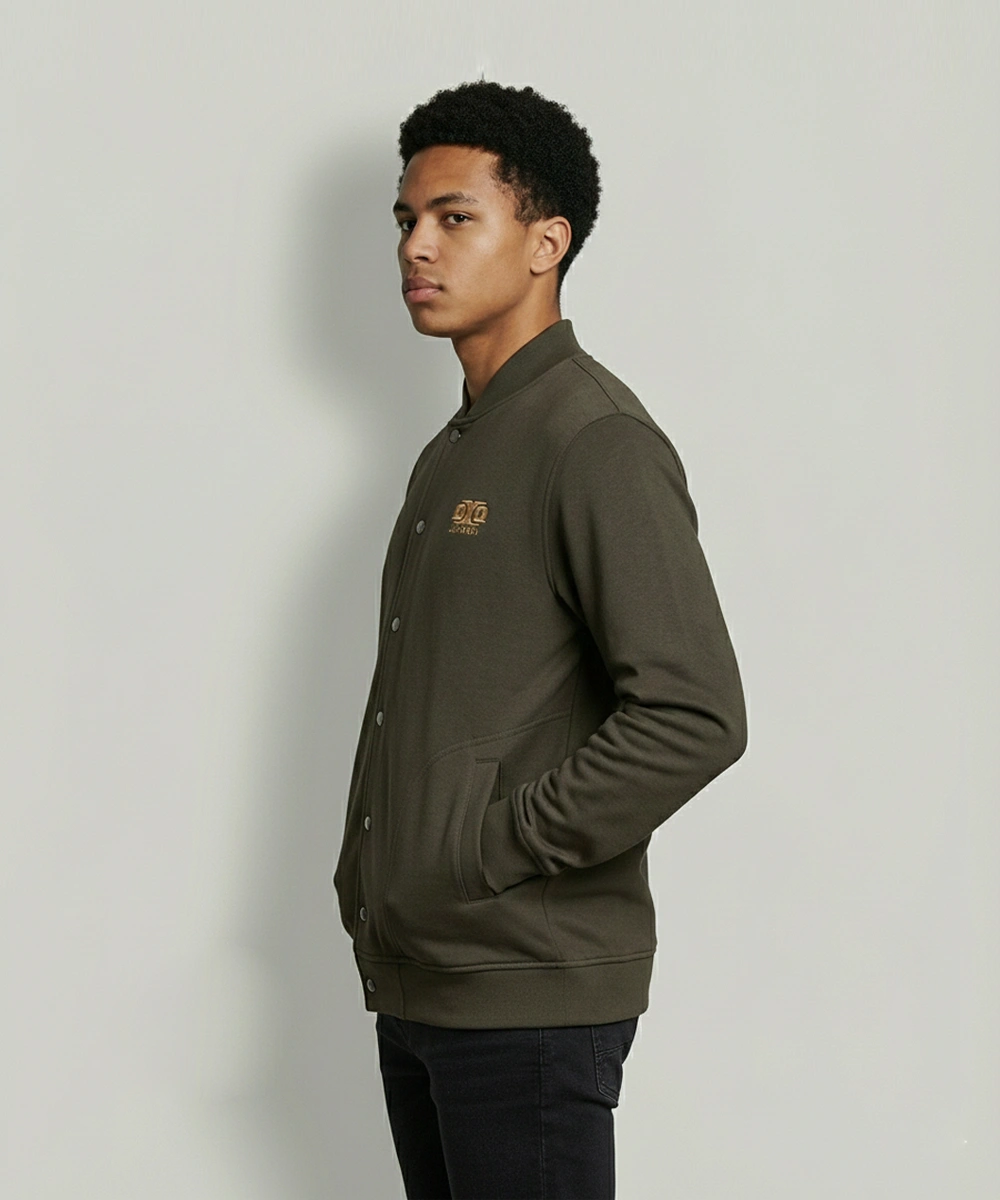 Modern Minimalist Design: A clean varsity-inspired jacket with a sleek snap-button front and smooth bomber-style structure.